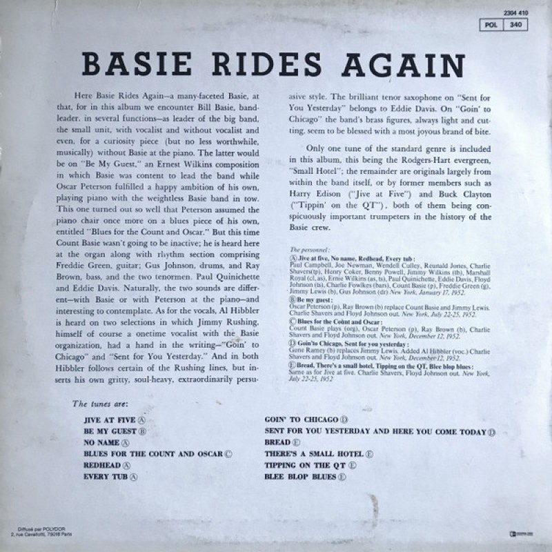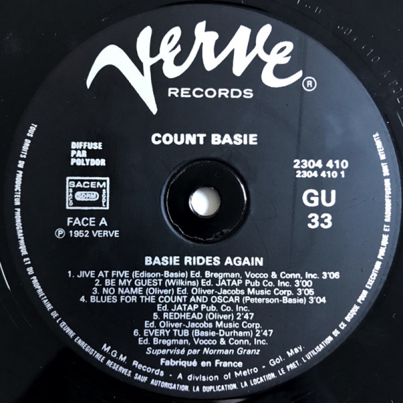 Notes: A Panoramic True HI-FI Recording ℗ 1952 VERVE A1, A3, A5, A6: recorded in New York, January 17, 1952 A2, B3, B4, B5: recorded in New York, July 22-25, 1952 A4, B1, B2: recorded in New York, December 12, 1952 Glossy laminate cover. Runouts are stamped. Title on labels, back cover: Basie Rides Again Track A5 on label: Tipping On The Q.T. Track publishers: A1, A6 to B2, B5, B6: Ed. Bregman, Vocco & Conn, Inc. A2, A4, B3: JATAP Pub. Co. Inc. A3, A5: Ed. Oliver-Jacobs Music Corp. B4: Ed. Chappell & Co. Inc.
