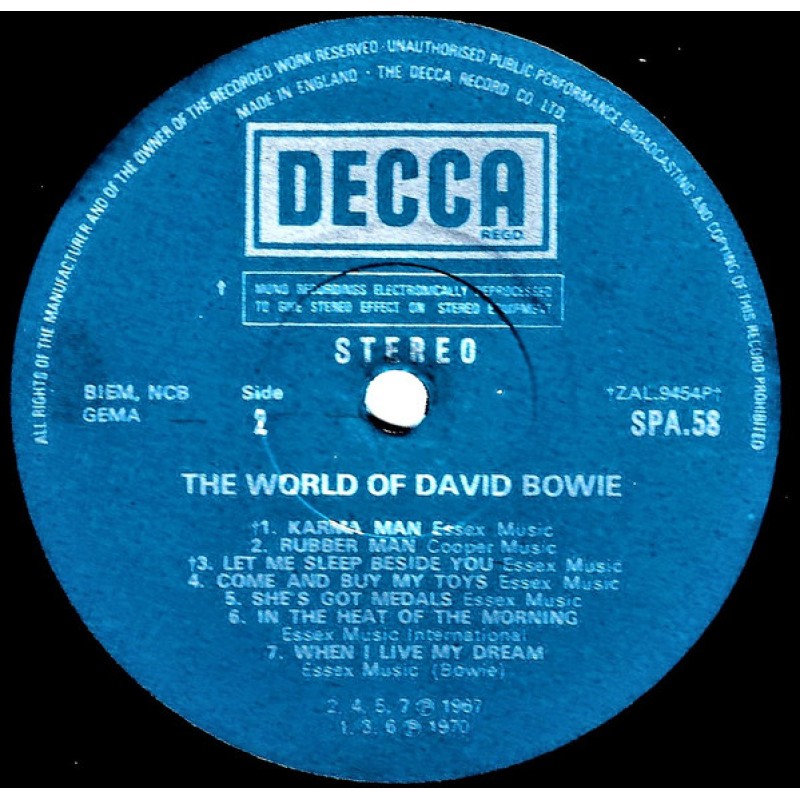 Notes: Second photo sleeve design, label variant: This version has: • Dark blue labels • Silver printing • Catalog number at right is SPA.58 Stereo edition reissued in 1973 of : The World Of David Bowie (Decca SPA 58), edited in Mono in 1970 (UK) with the addition of Silly Boy Blue. First cat # on sleeve Second cat # on label The sleeve is laminated on the front only. Vinyl labels blue and silver with a box under the DECCA logo which contains the wording 'Mono Recordings Electronically Reprocessed To Give Stereo Effect On Stereo Equipment'.