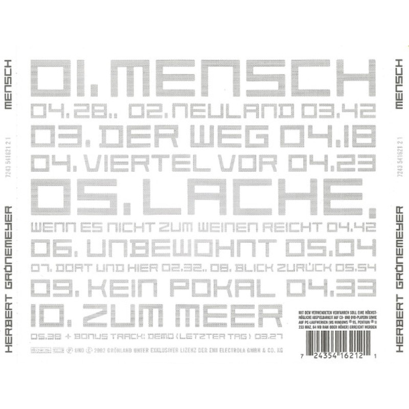 Notes: Released in a printed jewel case with clear tray and 16-page booklet. Studios: Grönland, Mayfair St 1-2, RAK, Abbey Road. ℗ und © 2002 Grönland unter exklusiver Lizenz der EMI Electrola GmbH & Co. KG Made in EU Track 11: – total duration of 20:40 min, featuring merely circa 6:40 min of music – contains a hidden track by Felix Grönemeyer, the son of Herbert Grönemeyer. – cue list: Track 11.a 00:00 - 03:27 (03:27) „Demo (Letzter Tag)“ performed by Herbert Grönemeyer and listed on the artwork Track 11.b 03:28 - 17:26 (13:58) silence Track 11.c 17:26 - 20:40 (03:13) untitled hidden track performed by Felix Grönemeyer, both not mentioned on the artwork