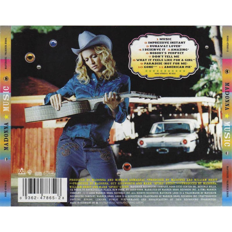 Notes: [Sticker on jewel case:] Featuring the hit singles "[url=/Madonna-Music/master/34710]Music[/url]" & "[url=/Madonna-American-Pie/master/34013]American Pie[/url]" 9362-47865-2 [Back:] Maverick Recording Company. Marketed by Warner Bros. Records Inc., a Time Warner company. © ℗ 2000 Warner Bros. Records Inc. Made in Germany by [Warner Music Manufacturing Europe logo] Mixed at Olympic Studios, London Recorded at Sarm East and Sarm West, London; Guerilla Beach, Los Angeles and The Hit Factory, NYC. Mastered at Metropolis Studios, London "American Pie" mastered at Master Disk, NYC Strings recorded at AIR Lyndhurst Studios, UK Track 8 (...) excerpt from "The Cement Garden", courtesy of [a180664] and [l255717] Tracks 1, 2, 4, 6: WB Music Corp./ Webo Girl Publishing, Inc. Admin. By WB Music Corp. ASCAP/1000 Lights Music Ltd./ Warner-Tamerlane Pub. Corp. BMI. Tracks 3, 5: WB Music Corp./ Webo Girl Publishing, Inc. Admin. By WB Music Corp. ASCAP/Rondor Music (London) Ltd. PRS. All Rights Adm. By Almo Music Corp. ASCAP In The U.S./Canada. Track 7: WB Music Corp./ Webo Girl Publishing, Inc. Admin By WB Music Corp. ASCAP/1000 Lights Music Ltd/ Warner-Tamerlane Pub. Corp. BMI/WB Music Corp./Lemz Music/True North Music ASCAP. Track 8: WB Music Corp./ Webo Girl Publishing, Inc. Admin. By WB Music Corp./Universal - Polygram Int’l. Pub. Inc. ASCAP. Track 9: 1000 Lights Music Ltd./Warner-Tamerlane Pub. Corp. BMI/WB Music Corp./ Webo Girl Publishing, Inc. Admin. By WB Music Corp. ASCAP. Track 10: WB Music Corp./Webo Girl Publishing, Inc. Admin. By WB Music Corp. ASCAP/Damian Le Gassick/Nik Young. Track 11: Songs Of Universal, Inc./Benny Bird Co. Inc. BMI Issued in a regular jewel case with Warner 'W' logo injection print. Includes a 16-page booklet with photos and credits. Some copies include a 6-panel (leporello-fold) insert promoting Madonna's discography and videography. Some copies have a holographic sticker on the jewel case, indicating the scheduled market with initials (e.g. BL, D, E, F, S, UK, I), followed by 9 random digits. Some copies have a paper sticker on the jewel case, with the text: Brit Awards with Mastercard 2001 Nominee.