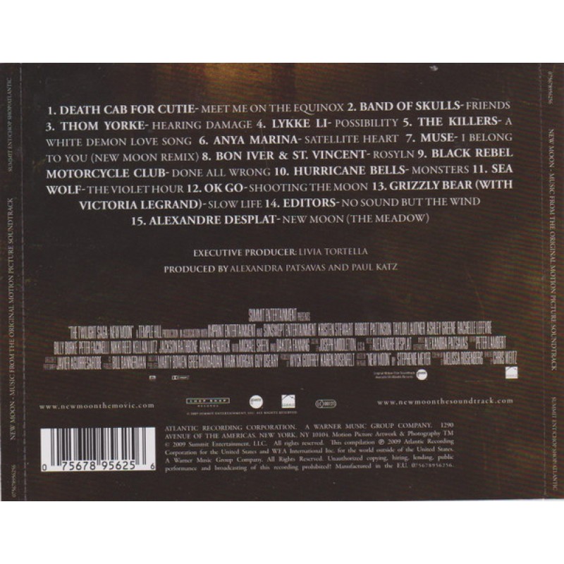 Notes: The sleeve folds out into a poster. Mastered and digitally edited at Mastering, Hollywood, CA. 1. Published by EMI Blackwood Music Incorporated on behalf of itself/Where I'm Calling From Music (BMI)/Shove It Up Your Songs (BMI)/Giant Beat Songs (BMI)/Please Pass the Songs (BMI)/Summit Base Camp Film Music (BMI) Courtesy of Atlantic Recording Corporation. 2. Published by PSY Collective LLC (PRS). Courtesy of Shangri-La Music, LLC/Phi/YouAreHere by arrangement with Zync Music. 3. Published by Warner-Tamerlane Publishing Corp. (BMI) o/b/o Warner/Chappell Music Ltd. (PRS) Courtesy of Xurbia Xendless Ltd. by arrangement with Warner/Chappell Music 4. Published by EMI Publishing Scandinavia/Summit Base Camp Film Music (BMI) Recorded and mixed at Decibel Studios, Stockholm Courtesy of Atlantic Recording Corp./Warner Music UK Ltd. 5. Published by Universal-PolyGram Int. Publishing, Inc. (ASCAP)/Rimutaka Music Publishing (ASCAP) Courtesy of The Island Def Jam Music Group 6. Published by WB Music Corp. (ASCAP) o/b/o itself, Chop Shop Arch Music and Many Clues Music/Rimutaka Music Publishing (ASCAP) Courtesy of Chop Shop Records/Atlantic Recording Corp. 7. Published by WB Music Corp. (ASCAP) o/b/o Loosechord Ltd. (PRS) Courtesy of A&E Records Limited, under exclusive license to Warner Bros. Records Inc. 8. Published by Chrysalis Music on behalf of April Base Publishing (ASCAP) Bon Iver appears courtesy of Jagjaguwar and St. Vincent appears courtesy of 4AD 9. Published by Chrysalis Music on behalf of itself and BRMC Music (ASCAP) Courtesy of Abstract Dragon 10. Published by Chrysalis Music on behalf of itself and Leave it to Stephen Music Publishing (ASCAP) Courtesy Invisible Brigades, LLC 11. Published by Affliated Music Publishing o/b/o Dangerbird Songs/Leaves in the River (ASCAP)/Rimutaka Music Publishing (ASCAP) Courtesy of Dangerbird Records 12. Published by OK Go Publishing (BMI) Courtesy of Capitol Records under exclusive license to EMI Music under license from EMI Music Licensing 13. Published by Doomed Beauty Music (BMI) admin. Bug/Summit Base Camp Film Music (BMI) Engineered at Germano Victoria Legrand is credited as "Victoria Legrand of Beach House" Grizzly Bear appears courtesy of Warp Records by arrangement with Zync Music Victoria Legrand appears courtesy of Sub Pop Records 14. Published by Soul Kitchen Music Ltd. administered by Kobalt Music Publishing America (BMI)/Summit Base Camp Film Music (BMI) Courtesy of Kitchenware Records 15. Published by Summit Base Camp Film Music (BMI) Courtesy of Summit Entertainment, Inc. Manufactured in the E.U.