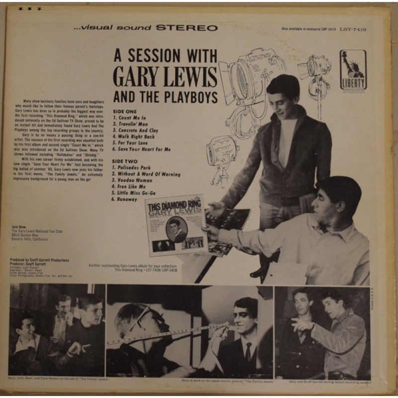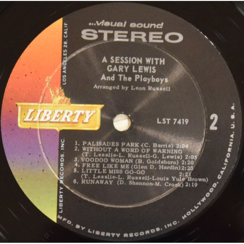 Notes: Labels: "A SESSION WITH GARY LEWIS And The Playboys" in narrow font "MFD. BY LIBERTY RECORDS, INC. HOLLYWOOD, CALIFORNIA, U.S.A." around the lower parts
