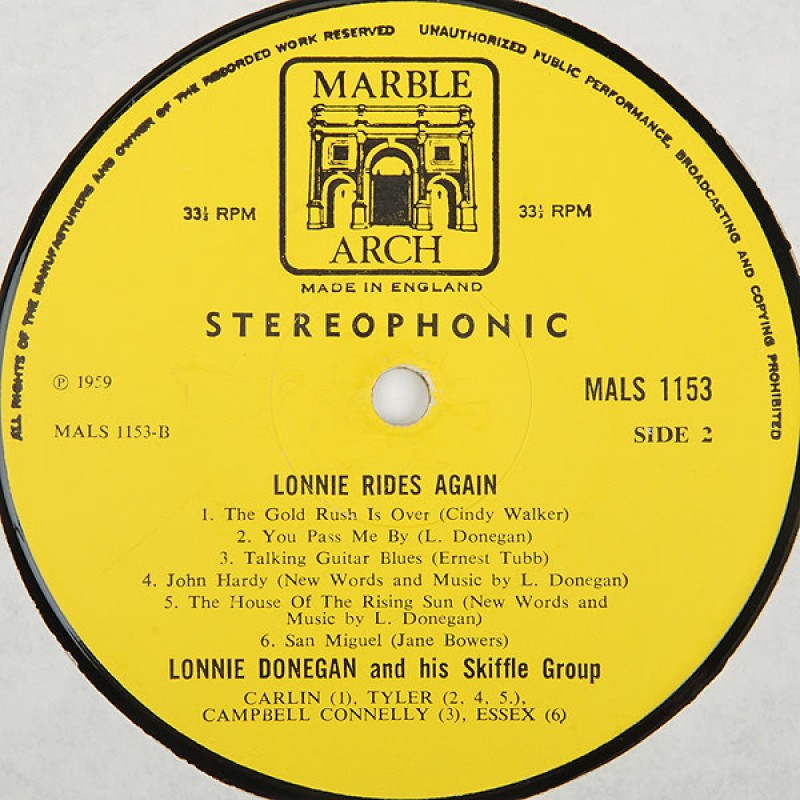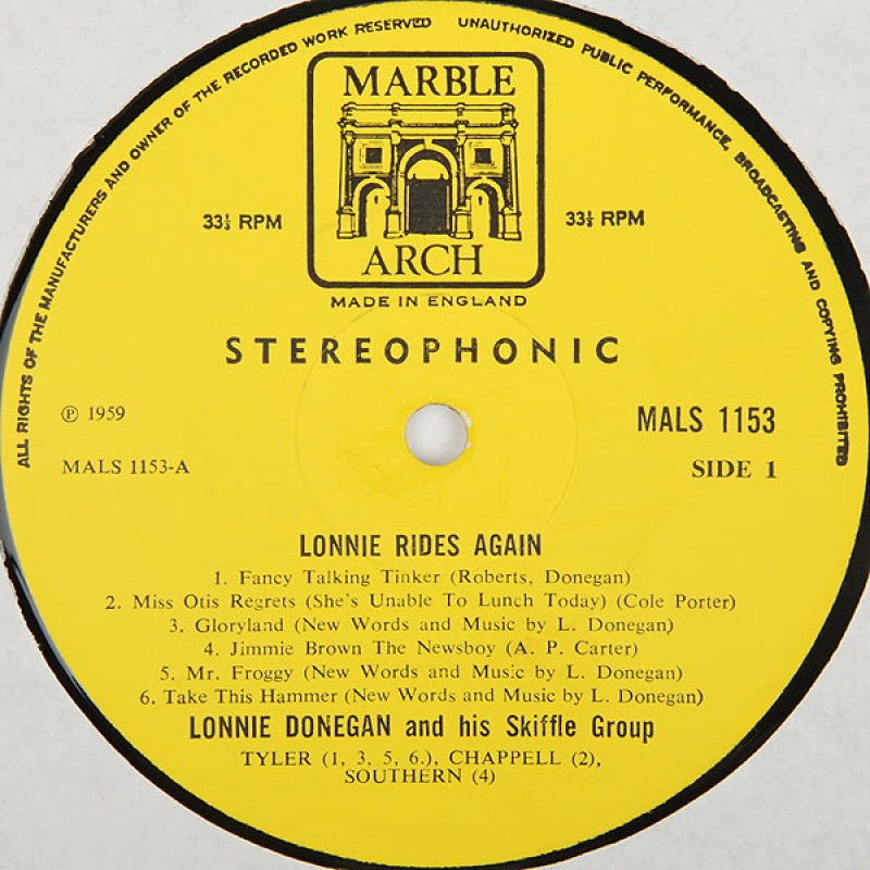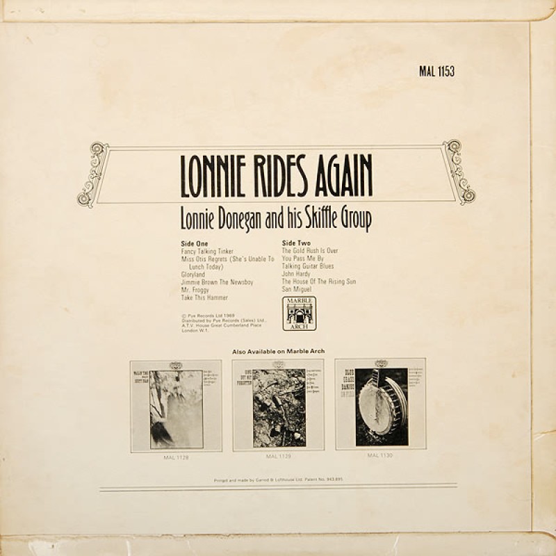Notes: Back cover: Printed and made by Garrod & Lofthouse Ltd. Patent no.943.895 Spine: LONNIE RIDES AGAIN ● LONNIE DONEGAN AND HIS SKIFFLE GROUP MARBLE ARCH RECORDS MAL 1153 Labels: Made in England 33 ⅓ RPM Stereophonic ℗ 1959 Side A publishers: Tyler (1, 3, 5, 6.) Chappell (2) Southern (4) Side B publishers: Carlin (1) Tyler (2, 4, 5.) Campbell Connelly (3) Essex (6) Flipback cover. Some releases has a sticker "STEREO MALS" glued on the original catalog number. Stamped runout except for the taxcode [KT] which is etched on both sides.