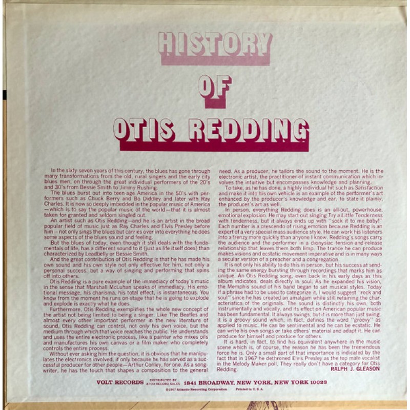Notes: All selections of this album were originally recorded in stereo with the exception of These Arms Of Mine, Pain In My Heart, Mr. Pitiful, & Security which have been electronically reprocessed for stereo from the original monophonic recordings. Released in a gatefold jacket This version can be identified by the runout grooves and by the text on the labels and, more specifically, the matrix numbers, which lack an alpha-ending. "W" etch in runout indicates original lacquer was cut using an [l=Audiodisc] blank.