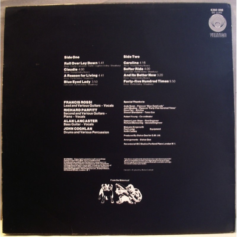A year later, the band changed name once again to "The Status Quo". [a=Rick Parfitt] (guitar) joined the band. Their first hit record, "Pictures of Matchstick Men", was released. "The" was omitted from the name of the band in 1969, known thereafter as just "Status Quo"