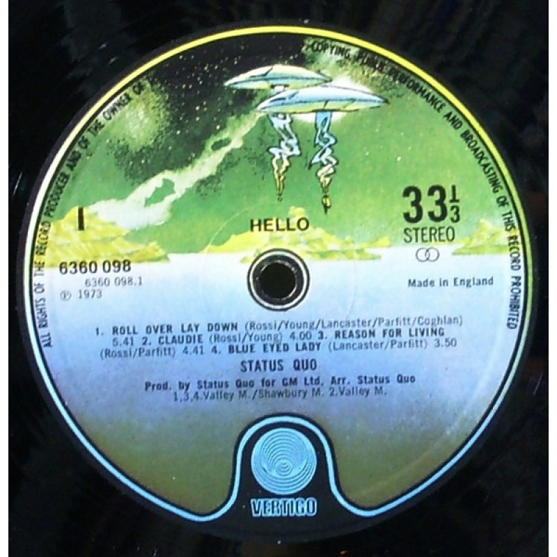 Notes: Second edition green spaceship vertigo centers and has embossed silver lettering on front of sleeve and white text on rear and spine, a lyric inner sleeve, and poster. Title on labels: Hello Sleeve: Produced for G.M. Ltd. Recorded at IBC Studios Printed in England by Robor Limited A1, A3, A4, B2, B4. Valley - Shawbury A2, B1, B3. Valley Music Labels: ℗ 1973 Made in England Produced for GM Ltd. A1, A3, A4, B4. Valley M./Shawbury M. A2, B1 to B3. Valley M. Runouts: Runouts are stamped except for 'DAMON AND MELS' (side A) and 'MELS' (side B).