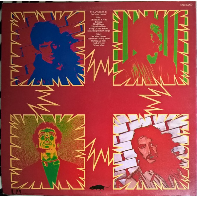 Notes: Original UK release in matt cover, on custom made picture labels. Printed top-opening cardboard picture/credits inner sleeve with rounded corners and a thumb cut-out. Published By April Music Ltd./Albion Music ℗ 1977 United Artists Records Ltd. Produced at T.W. Studios, Fulham, Completed July 1977 Mixed at Olympic Studios, Barnes © 1977 United Artists Records Limited Printed in England by Robert Stace Spine states: 'UAG 30200 STRANGLERS IV NO MORE HEROES UNITED ARTISTS' Colour labels with text in white also credit: 'STRANGLERS IV NO MORE HEROES' below the Artist / Title credit incorporated in the graphics. Label rim text: 'Made In England A Product Of United Artists Records Ltd' The Stranglers are Albion Artistes: Albion Management, 12 Putney Bridge Road, London SW18 Stranglers Information Service: Tony Moon, Strangled Magazine, 40 Wood Yates Road, London SE12 Cutting and pressing derived from stamped and etched text in runouts. Runouts [Matrix strings/stampers/mothers] are stamped, remainder is etched. (Variant 7 runout side B: A4 is difficult to read - maybe it is neither A nor 4)