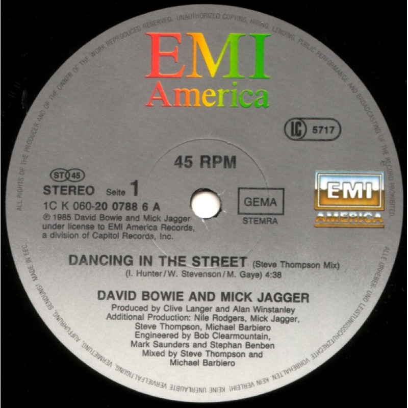 Notes: Release title on spine: Dancing In The Street (Steve Thompson Mix) Cover version of [r2224267] On labels: ℗ 1985 David Bowie and Mick Jagger under licence to EMI America Records, a division of Capitol Records, Inc. Made in EEC On front cover: Specially priced 12" single On back cover: Single [url=http://www.discogs.com/David-Bowie-And-Mick-Jagger-Dancing-In-The-Street/release/940968]1C 006-20 0787 7[/url] © 1964 Jobete Music, Ivy George Hunter, William Stevenson, Marvin Gaye. © ℗ 1985 David Bowie and Mick Jagger under licence to EMI America Records, A division of Capitol Records Inc., a subsidiary of Capitol Industries-EMI, Inc., Marketed, manufactured and distributed by EMI. Printed in Germany by 4P Nicolaus GmbH, Köln. Similar version with different labels is [r=4543972]. Similar version with just '12" single' instead of 'Specially priced 12" single' on front cover is [r=10152557].