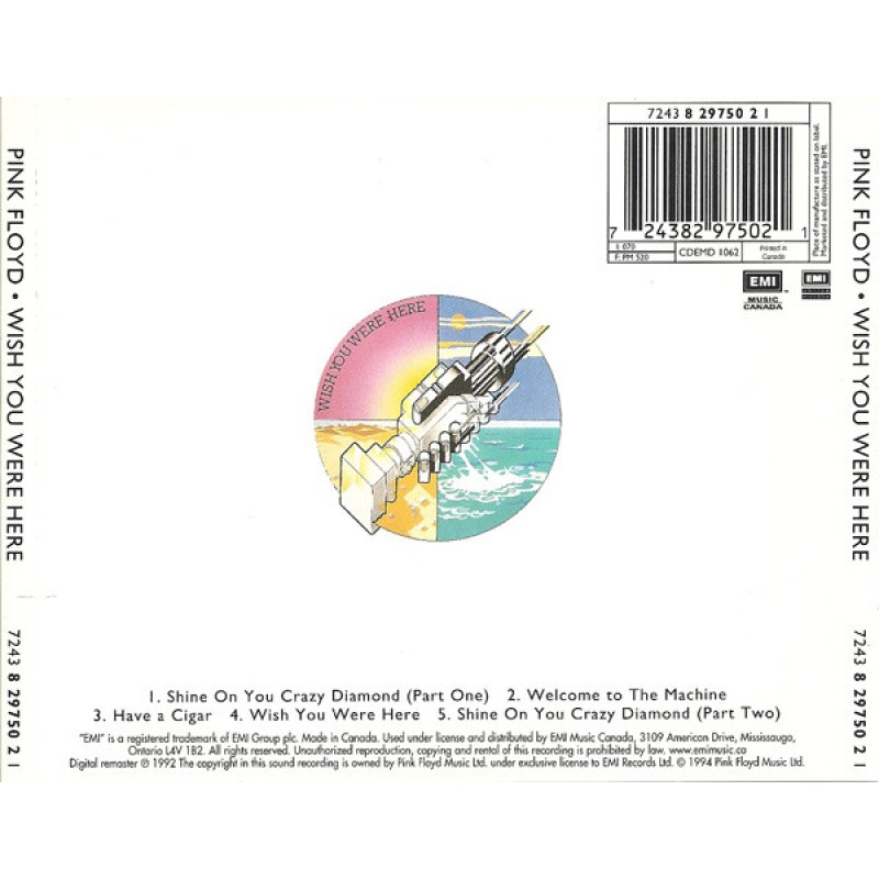 Notes: Recorded at Abbey Road Studios January to July 1975. Digitally remastered at The Mastering Lab, LA. Thanks to Bernie Caulder and Phil Taylor. Digital remaster ℗ 1992 The copyright in this sound recording is owned by Pink Floyd Music Ltd. under exclusive license to EMI Records Ltd. © 1994 Pink Floyd Music Ltd. Catalogue numbers: 7243 8 29750 2 1 , UK: CDEMD 1062 Made in Canada. Printed in Canada. Marketed and distributed by EMI. Issued in a standard jewel case with sixteen page booklet.