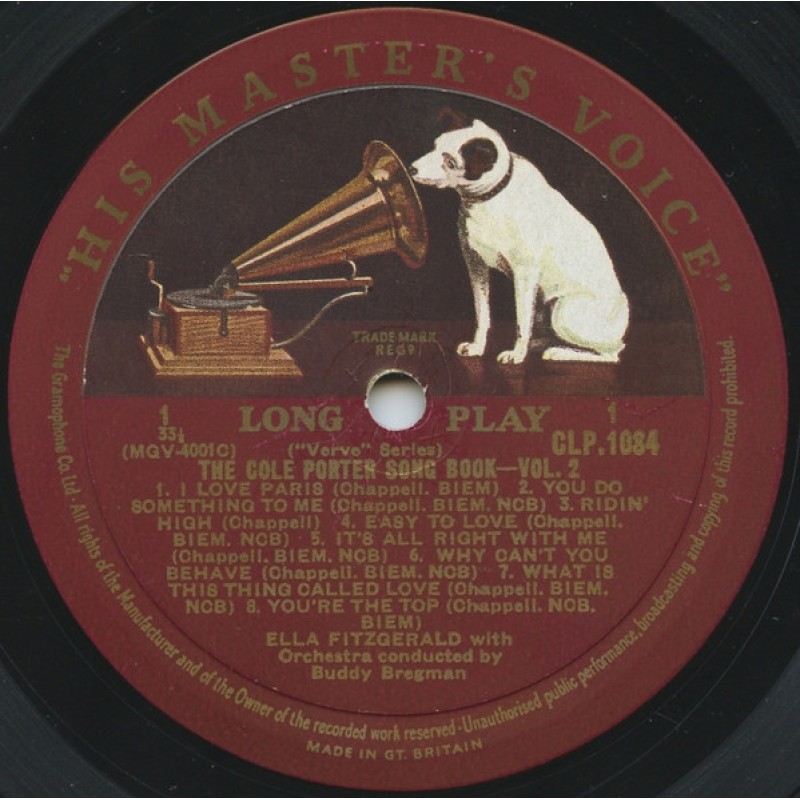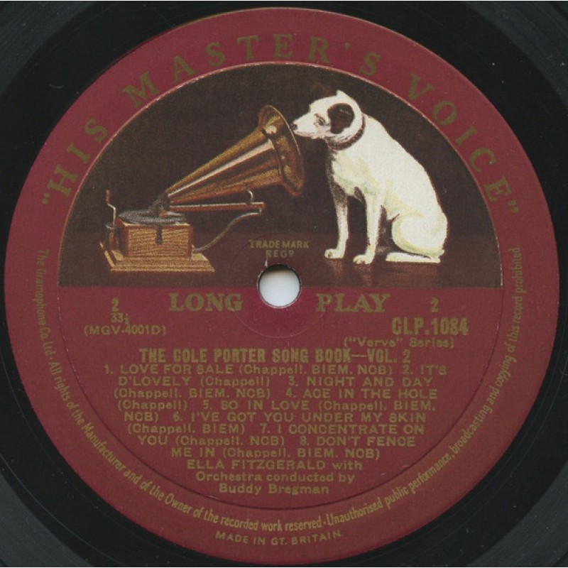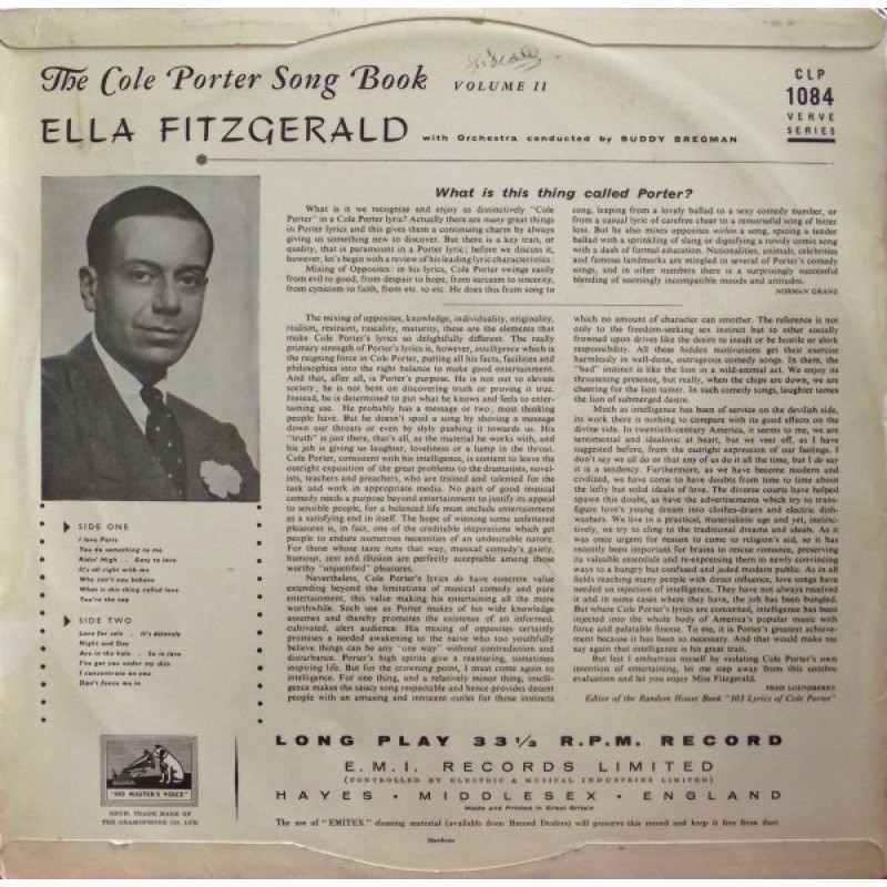 Notes: Issued with 'Nipper' labels with gold print; laminated 'flipback' sleeve with die-cut curved foldover. Title appears as 'Sings The Cole Porter Song Book' on the front cover, as 'The Cole Porter Song Book volume II' on back cover. On labels: 'The Cole Porter Song Book-Vol. 2' Ella Fitzgerald with Orchestra conducted by Buddy Bregman. On back cover: Made and Printed in Great Britain. Mardons Recorded in February and March, 1956. "Introducing wonderful new records from the American Verve repertoire on His Master's Voice", Gramophone magazine, September 1956, back cover. Publishing credits: A1 Chappell. BIEM. A2 Chappell. BIEM. NCB. A3 Chappell. A4 Chappell. BIEM. NCB. A5 Chappell. BIEM. NCB. A6 Chappell. BIEM. NCB. A7 Chappell. BIEM. NCB. A8 Chappell. BIEM. NCB. B1 Chappell. BIEM. NCB. B2 Chappell. B3 Chappell. BIEM. NCB. B4 Chappell. B5 Chappell. BIEM. NCB. B6 Chappell. BIEM. B7 Chappell. NCB. B8 Chappell. BIEM. NCB.