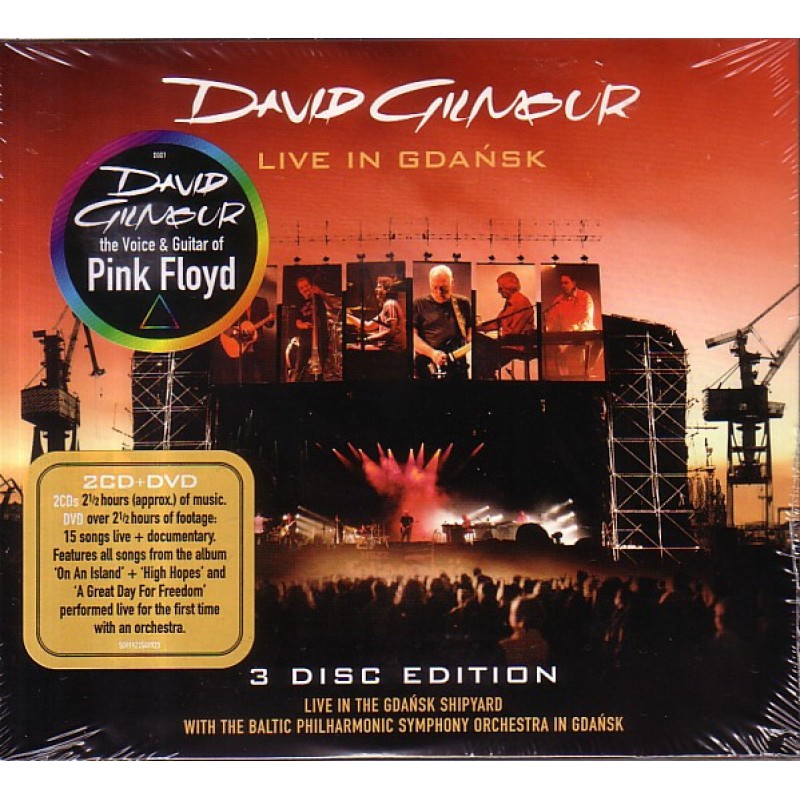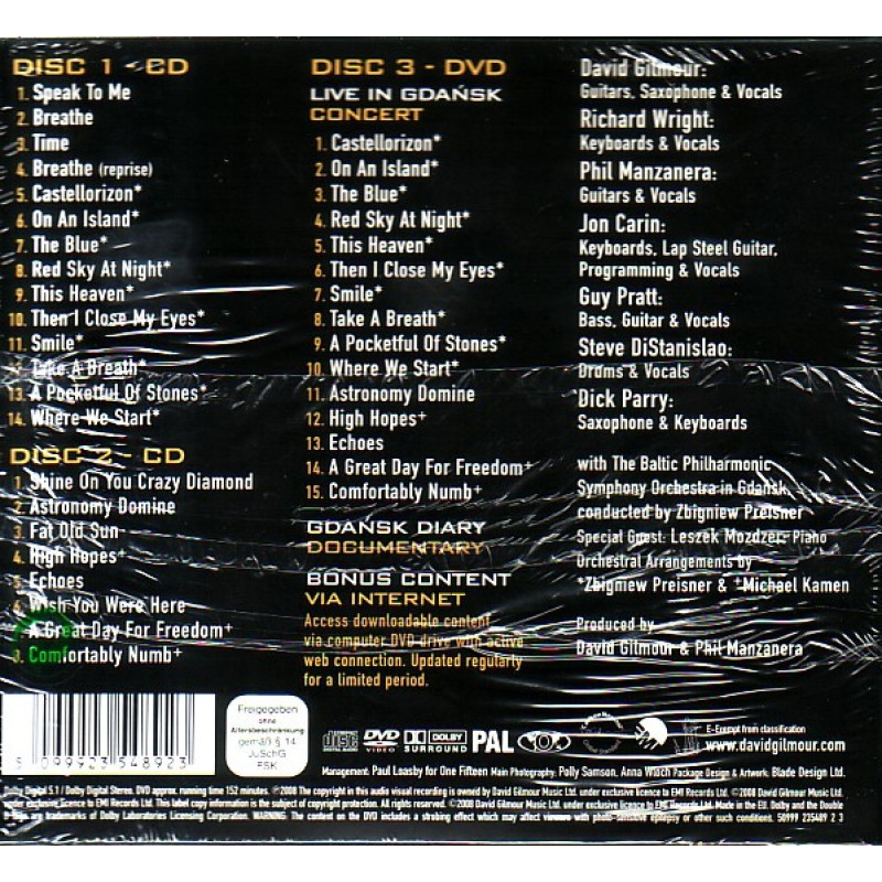 Notes: David Gilmour Live In The Gdańsk Shipyard With The Baltic Philharmonic Symphony Orchestra In Gdansk. Disc 1 - CD (Approx. 69mins) Disc 2 - CD (Approx. 79mins) Disc 3 - DVD (Approx. 152mins): Live In Gdansk: Concert & Gdansk Diary Documentary ℗ & © 2008 The copyright of this audio visual recording is owned by David Gilmour Music Ltd. under exclusive license to Parlophone Records Ltd. A Warner Music Group Company. Dolby and the Double D logo are trademarks of Dolby Laboratories Licensing Corporation. Made in EU. Six panel digisleeve with 12-page booklet. Audio format: Dolby Digital 5.1 / Dolby Digital Stereo.