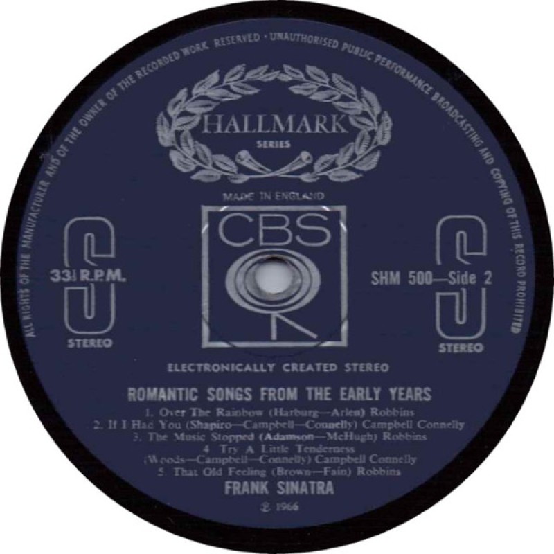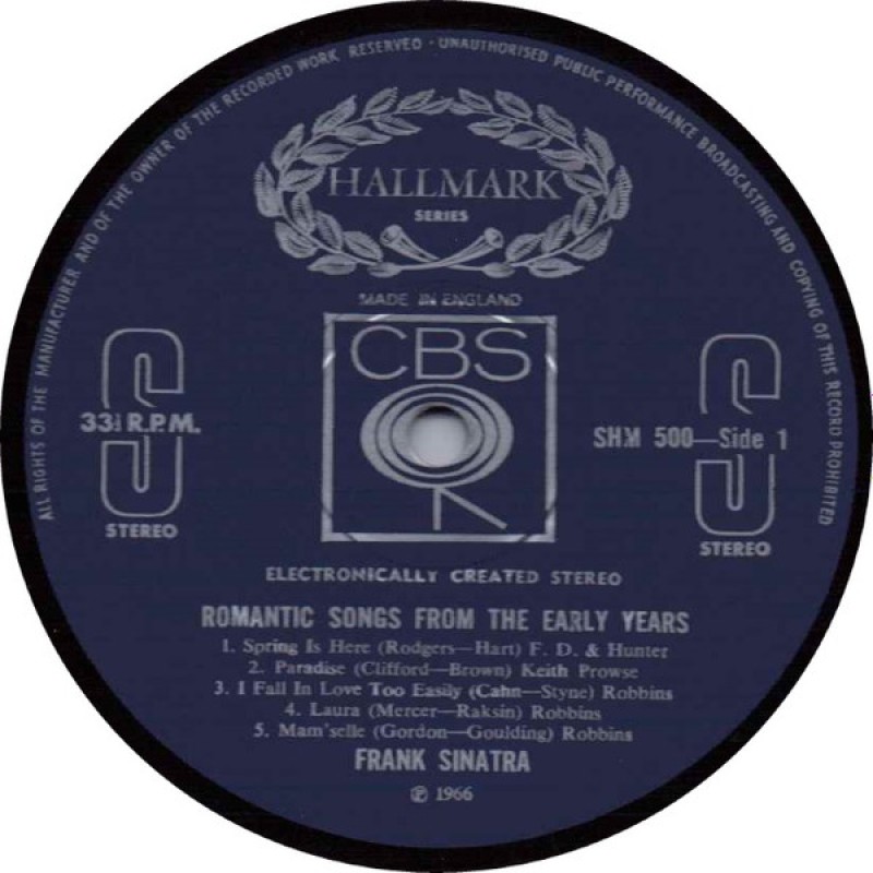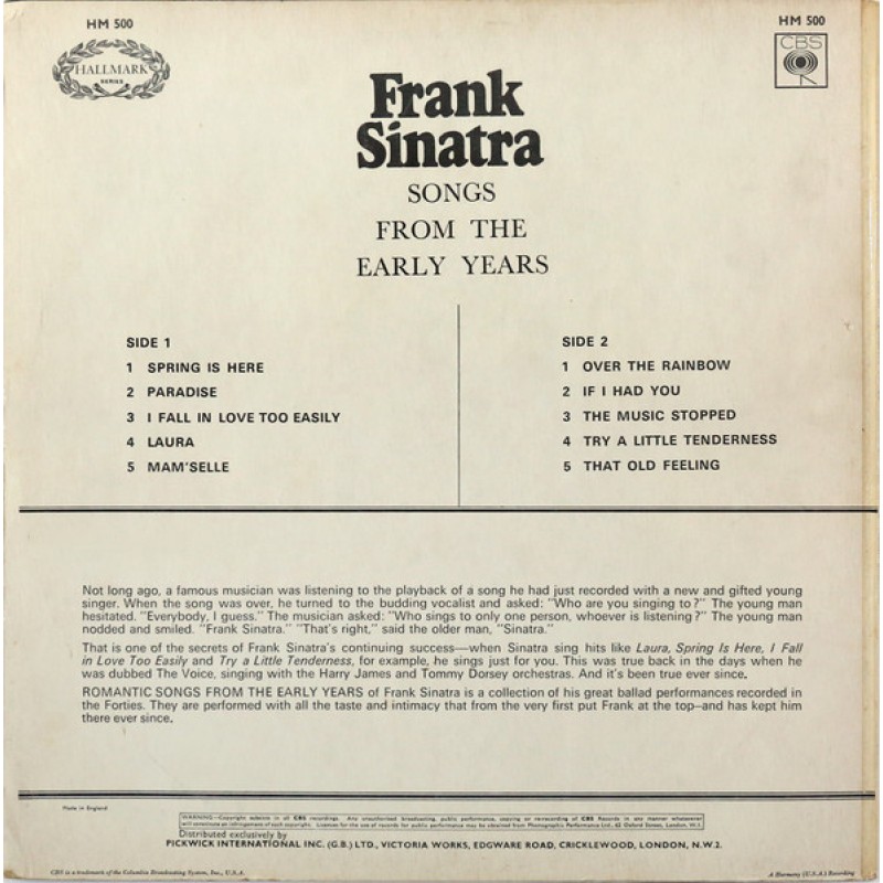 Notes: ℗ 1966 On the front cover there is 'CBS' logo and 'Hallmark Series' logo, with the cat.no. HM 500 beside the Hallmark logo. On the rear cover, both logos are shown with HM 500 beside each logo. Sticker on front cover: "Electronically STEREO Rechanelled Mono recording electronically reprocessed to give stereo effect on stereo equipment" Sticker in gold & red. On back cover, "Made in England" and Distributed Exclusively by Pickwick International Inc.(G.B.) Ltd. The album title changes on the back cover and becomes "Songs From The Early Years" Published By: A1: F. D. & Hunter A2: Keith Prowse A3, A4, A5, B1, B3, B5: Robbins B2, B4: Campbell Connelly