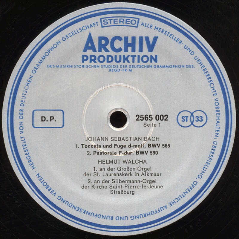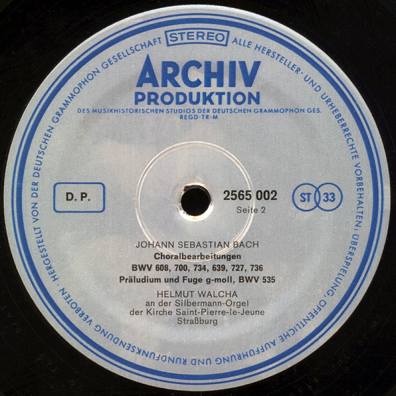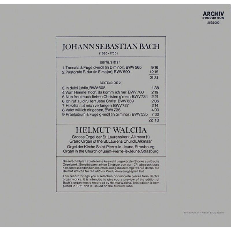 Notes: German initial release: - large press ring - Jänecke as printing company - without 320 in runouts Sleeve info: Silver metalic sleeve On back sleeve: This record brings you a selection of complete pieces from Bach's organ works. It is intended to give you a preview of the edition of Bach's complete organ music recorded by Helmut Walcha. this edition is completed in 1971 and is issued on the Archive label. Printed in Germany by Gebrüder Jänecke, Hannover On spine: Stereo   Hi-Fi Orgel — Bach · Walcha   2565 002 On labels: Copyright message in German, "Alle Hersteller..." at 1 o'clock