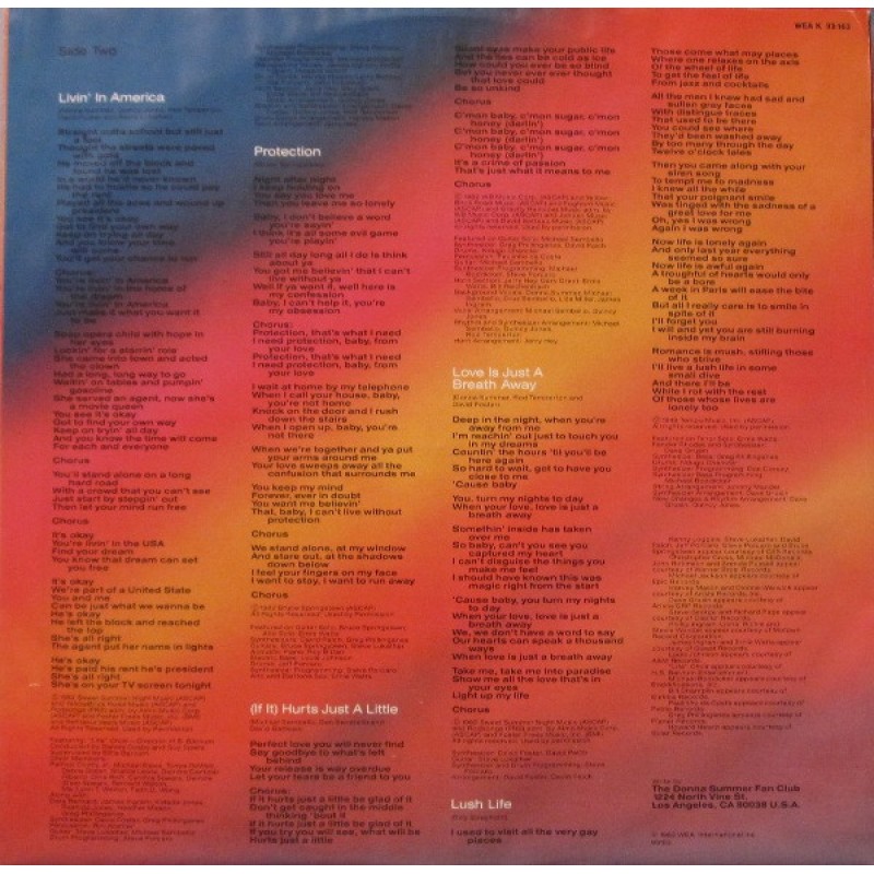 Notes: Label with plain background and shadow logos, Label code under cat#. A similar release exists with a different label (horizontally lined), see here: [url=http://www.discogs.com/release/3177738] Donna Summer [/url]. Labels: Made in Germany by WEA Musik GmbH a Warner Communications Company Sleeve: Manufactured in Germany by Record Service GmbH, Alsdorf - Pressé en Allemagne par Record Service GmbH, Alsdorf a Warner Communications Company ℗ + © 1982 WEA International Inc.