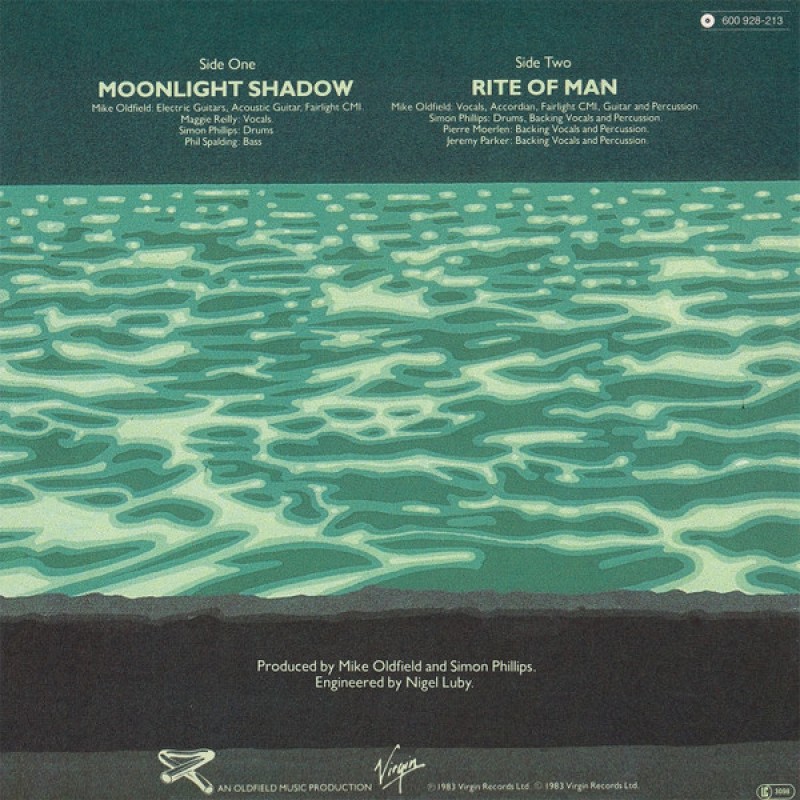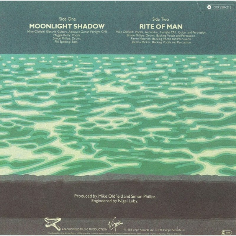 Notes: Side A: Published by Virgin Music (Publishers) Ltd. Side B: Published by Virgin Music (Publishers) Ltd. / Calmet / Eaton Ltd. ℗ 1983 Virgin Records Ltd. © 1983 Virgin Records Ltd. An Oldfield Music Production Made in Germany Distributed by the Ariola Group of Companies Printed in Western Germany by Mohndruck Graphische Betriebe GmbH, Gütersloh Also exists with [url=http://www.discogs.com/Mike-Oldfield-Moonlight-Shadow-Extended-Version/release/2899190]different cover artwork[/url]. Cat# 600 928 appears on record label. Cat# 600 928-213 appears on sleeve. Runouts are stamped, except for the part "020" which is etched.