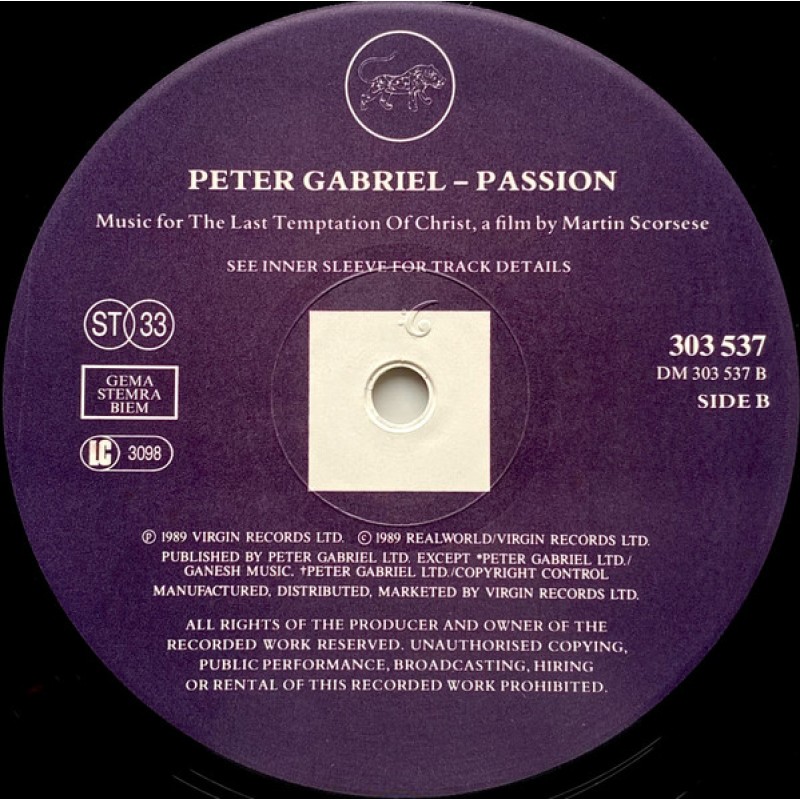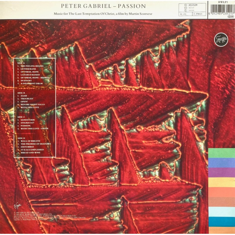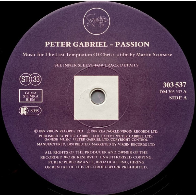 Notes: Soundtrack to the Martin Scorsese film 'The Last Temptation of Christ', re-titled as a result of legal barriers. Recorded between February 1988 and March 1989 at Real World Studios, Box, England. Mastered at Town House Cutting Room. The following tracks contain selections from existing recordings of traditional music. Track A1 - The Doudouks are playing an Armenian melody 'The Wind Subsides', recorded for Ocora Records under the direction of Robert Ataian. Track A4 - Incorporates a traditional melody from Kurdistan. Kurdish Duduks are from Unesco Collection - A Musical Anthology of the Orient, General Editor Alain Danielou for Musicaphon Records. Track B1 - Written around a traditional Egyptian rhythm which is performed to fend off evil spirits. Track B3 - Based on an improvisation by Shankar and Peter Gabriel. Track B4 - The Ney Flute is playing a traditional Armenian melody. Track C2 - Based on an improvisation by Mahmoud and Peter Gabriel. Printed inner sleeves. ℗ 1989 Virgin Records Ltd. © 1989 Real World/Virgin Records Ltd. A very similar edition, [r=16914411], has a different German price code, D: 370, whereas this edition has D: 406. TOPAC Gesellschaft für Tonträger-Verpackung mbH is explicitly credited on back cover, TOPAC identified by ▷◁ symbol impressed on back cover.