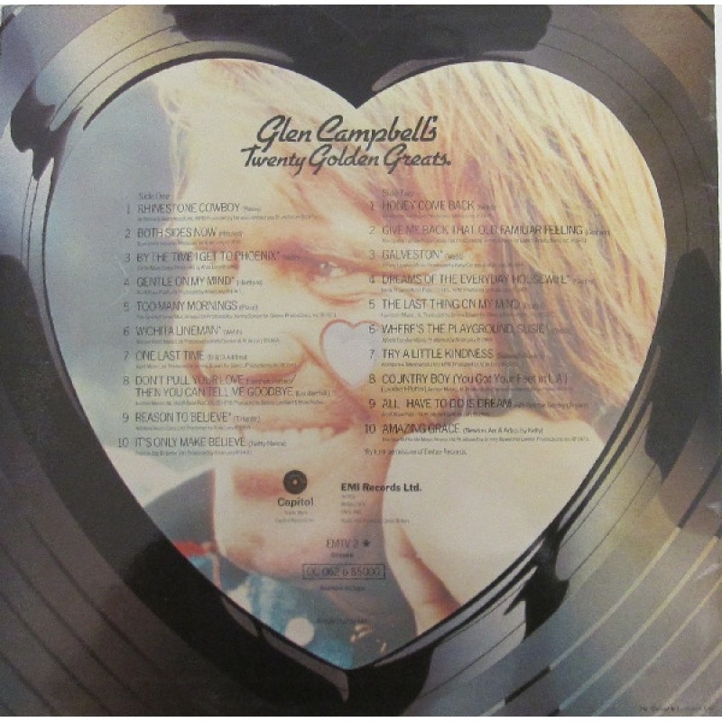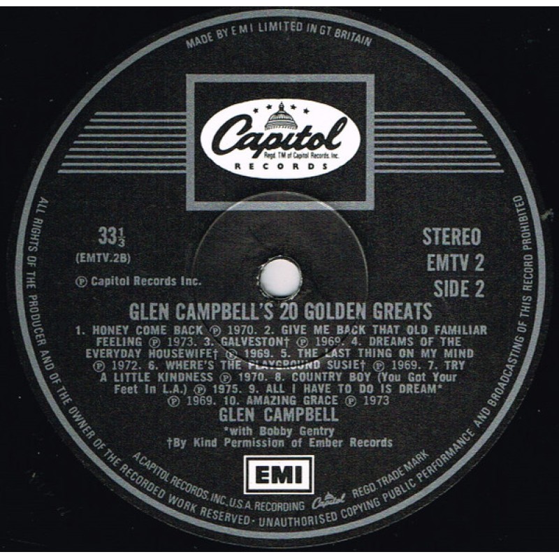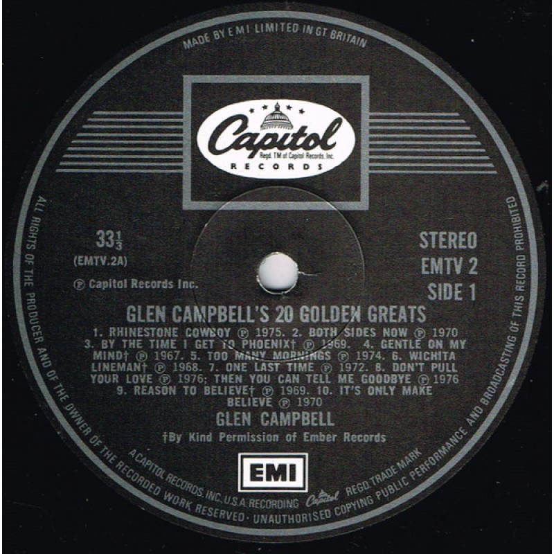Notes: Laminated Sleeve Made and printed in Great Britain Label reads: Glen Campbell's 20 Golden Greats The Guinness Book of British Hit Albums states this release cat No EMTV 2 entered the charts in November 1976 Publishers etc: A1: Ardmore & Beechwood Ltd./KPM ℗1975 A2: Essex International ℗ 1970 A3: Carlin Music Corp. ℗1969 A4: Acuff Rose Publ. Ltd. ℗1967 A5: The Sparta Florida Mus. Group Ltd. Produced for Glenco Productions, Inc. ℗ 1974 A6: Warner Bros Music Ltd. ℗1968 A7: April Music Ltd. ℗1972 A8: Anchor Music Ltd./Acuff Rose Publ. Ltd. ℗1976 A9: Robbins Music Corp. Ltd. ℗1969 A10: Francis Day & Hunter Ltd. ℗1970 B1: Jobete-London Music ℗1970 B2, B10: The Sparta Florida Music Group Ltd. Produced for Glenco Productions, Inc.℗1973 B3: Jobete-London Music ℗1969 B4: Keith Prowse Music Publ. Co. Ltd./KPM ℗1969 B5: Harmony Music Ltd. Produced for Glenco Productions Inc. ℗1972 B6: Jobete-London Music. ℗1969 B7: Ardmore & Beechwood Ltd./KPM. ℗1970 B8: Anchor Music Ltd. ℗1975 B9: Acuff Rose Publ. Ltd. ℗1969