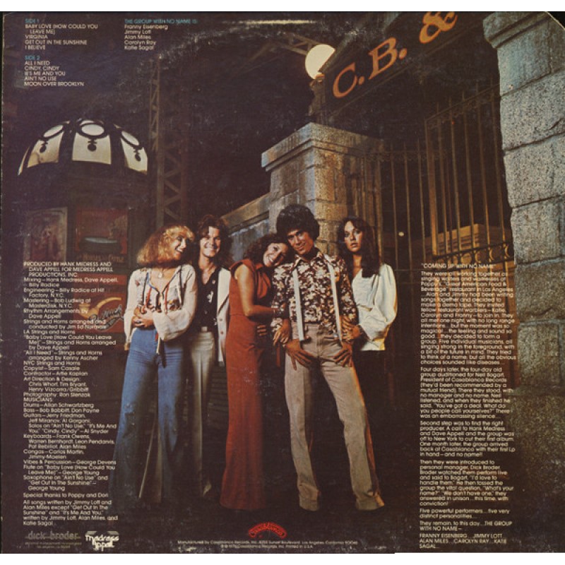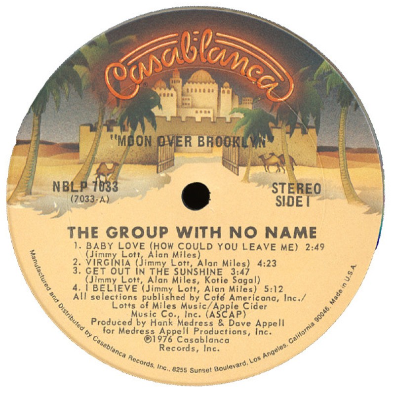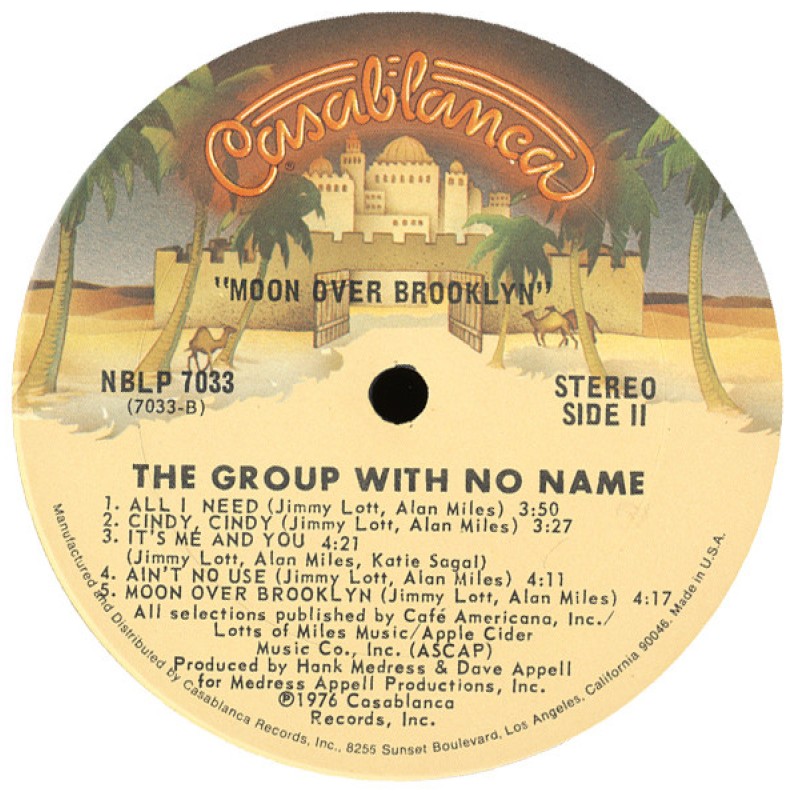 "The Group With No Name" was an American pop/rock group from the mid-70s, who released only one album, "Moon Over Brooklyn".