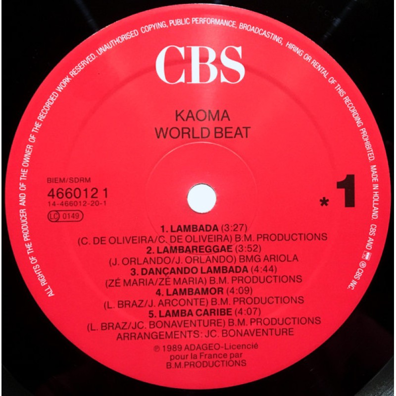 Notes: ℗ & © 1989 Adageo - Licencié pour la France par B.M. Productions Made in Holland / Distribue en France par CBS Discques S.A. Some copies with circular sticker on front: "Includes: Lambada / Dancando Lambada 14-466012-20" Stamped runouts, except last additional letter