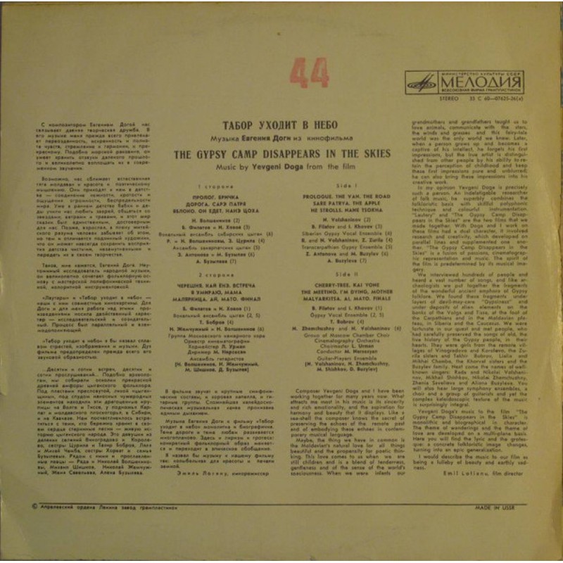 Notes: Музыка Евгения Доги Из Кинофильма "Табор Уходит В Небо" Music By Yevgeni Doga from the film "The Gypsy Camp Disappears In The Skies" --- © Апрелевский ордена Ленина завод грампластинок.