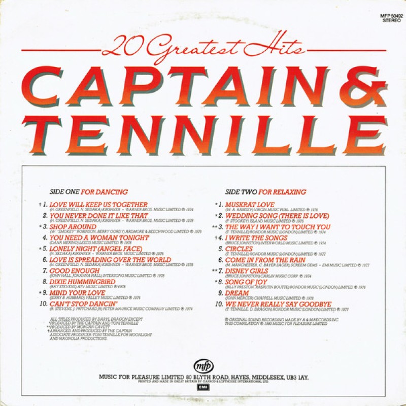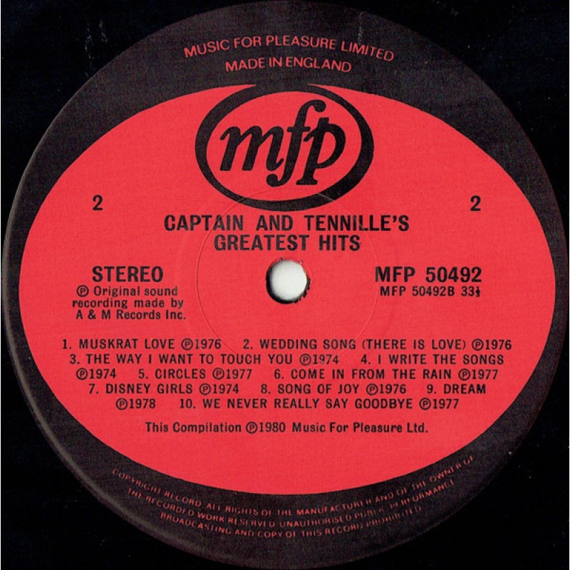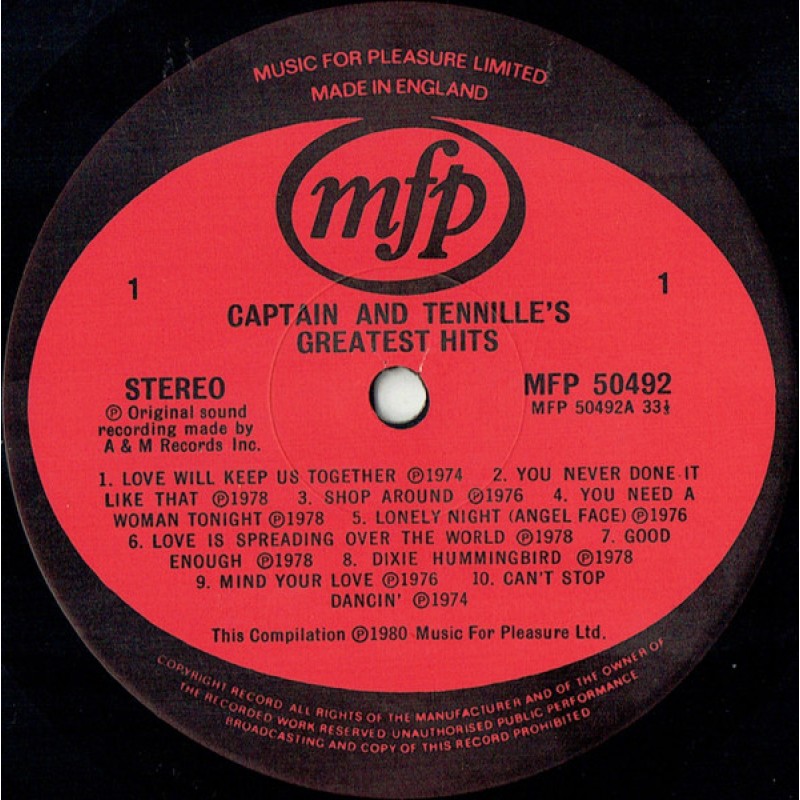 Notes: Spine credits 'Captain And Tennille'. Title on labels: 'Captain And Tennille's Greatest Hits'. Rear cover: Associate producer: Toni Tennille for Moonlight And Magnolia Productions. ℗ Original sound recording made by A & M Records Inc. This compilation ℗ 1980 Music For Pleasure Limited Printed and made in Great Britain by Garrod & Lofthouse International Ltd. A1 Kirshner - Warner Bros. Music Limited ℗ 1974 A2, A6 Kirshner - Warner Bros. Music Limited ℗ 1978 A3 Ardmore & Beechwood Limited ℗ 1976 A4 Leeds Music Limited ℗ 1978 A5 Kirshner - Warner Bros. Music Limited ℗ 1976 A7 Intersong Music Limited ℗ 1978 A8 ATV Music LImited ℗ 1978 A9 Valley Music Limited ℗ 1976 A10 Peter Maurice Music Company Limited ℗ 1974 B1 Virgin Music Publ. Limited ℗ 1976 B2 Island Music Limited ℗ 1976 B3 Rondor Music (London) Limited ℗ 1974 B4 Interworld Music Limited ℗ 1974 B5, B10 Rondor Music (London) Limited ℗ 1977 B6 Screen Gems - EMI Music Limited ℗ 1977 B7 Carlin Music Corp. ℗ 1974 B8 Rondor Music (London) Limited ℗ 1976 B9 Chappell Music Limited ℗ 1978 Labels: Made in England ℗ Original sound recording made by A & M Records Inc. This compilation ℗ 1980 Music For Pleasure Ltd. A1, A10, B3, B4, B7 ℗ 1974 A2, A4, A6 to A8, B9 ℗ 1978 A3, A5, A9, B1, B2, B8 ℗ 1976 B5, B6, B10 ℗ 1977 Runouts: Matrix stamped at six o'clock, numerical stampers at three and nine o'clock. - Another version exists, [r4256928], pressed by [l=CBS Pressing Plant, Aston Clinton].