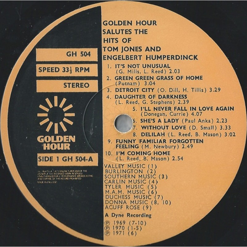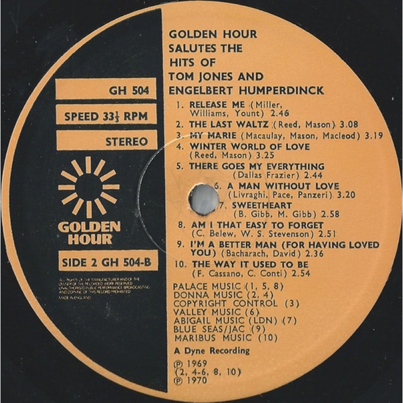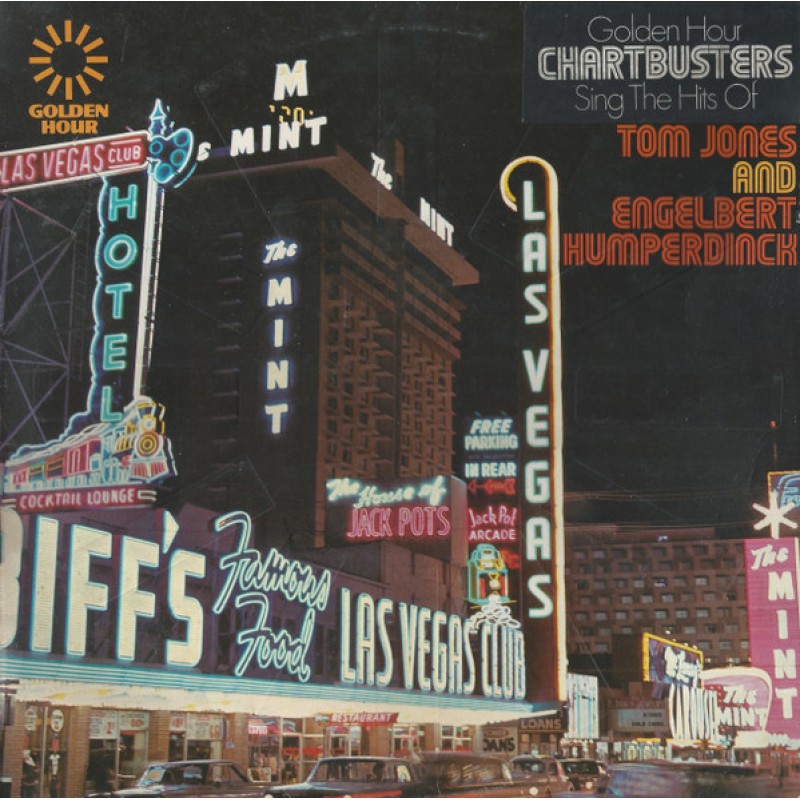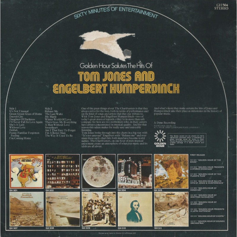 Notes: Embossed cover. Title on front cover, Golden Hour Salutes the Hits Of Tom Jones And Engelbert Humperdinck, however a sticker has been placed over the title so it reads: Golden Hour Chartbusters Sing The Hits Of Tom Jones And Engelbert Humperdinck. Title on spine, back cover and labels: Golden Hour Salutes The Hits Of Tom Jones And Engelbert Humperdinck. A Dyne recording. Printed and made by Garrod & Lofthouse Ltd. Made in England. A1, B6 - Valley Music A2 - Burlington A3 - Southern Music A4 - Carlin Music A5 - Tyler Music A6 - M.A.M. Music A7 - Duchess Music A8, A10, B2, B4 - Donna Music A9 - Acuff Rose B1, B5, B8 - Palace Music B3 - Copyright control B7 - Abigail Music (Ldn) B9 Blue Seas / Jac B10 Maribus Music A7 to A10, B1, B3, B7, B9 ℗ 1969 A1 to A5, B2, B4 to B6, B8, B10 ℗ 1970 A6 ℗ 1971