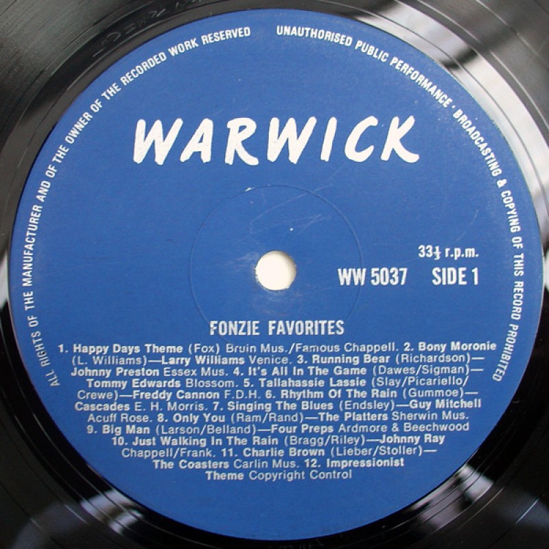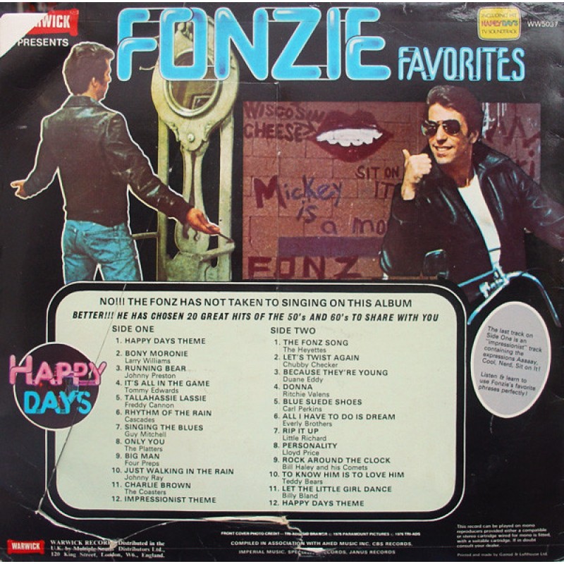 Notes: The last track on Side One is an "impressionist" track containing the expressions Aaaaay, Cool, Nerd, Sit on it! Listen and learn to use Fonzie's favorite phrases perfectly! Cat. no WW5037 on sleeve, WW 5037 on labels. Novelty cover: back is die cut to open up like a picture frame stand. Front cover photo credit - TRI-ADS/Sid Brawer © 1976 Paramount Pictures © 1976 Tri-Ads