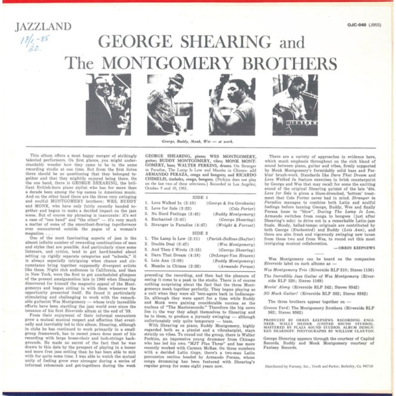 Notes: © 1982 Fantasy, Inc. Printed in U.S.A. Recorded in Los Angeles; October 9 and 10, 1961. [Recorded at] United Sound Studios. George Shearing appears through the courtesy of Capitol Records. Buddy and Monk Montgomery courtesy of Fantasy Records. Distributed by Fantasy, Inc., Tenth and Parker, Berkeley, Ca. 94710 Catalog numbers: OJC-040 - Back cover, spine, labels 955 - Front cover J955 - Back cover J-955 - Labels Publishing: A1 - Chappell Music-ASCAP A2 - Warner Bros. Music-ASCAP A3 - Orpheum Music-BMI A4 - Bayes Music-BMI A5 - Frank Music-ASCAP B1 - Robbins Music-ASCAP B2 - Taggie Music-BMI B3 - Bayes Music-BMI B4 - Scarsdale Music / Lewis Music-ASCAP B5 - West Coast Music-BMI B6 - Bayes-BMI