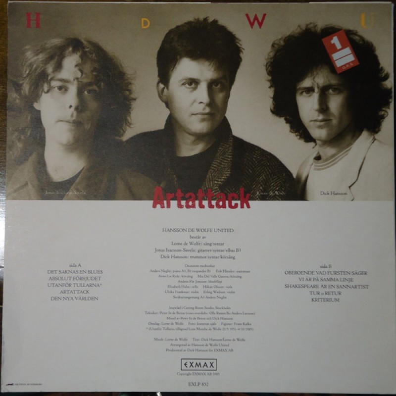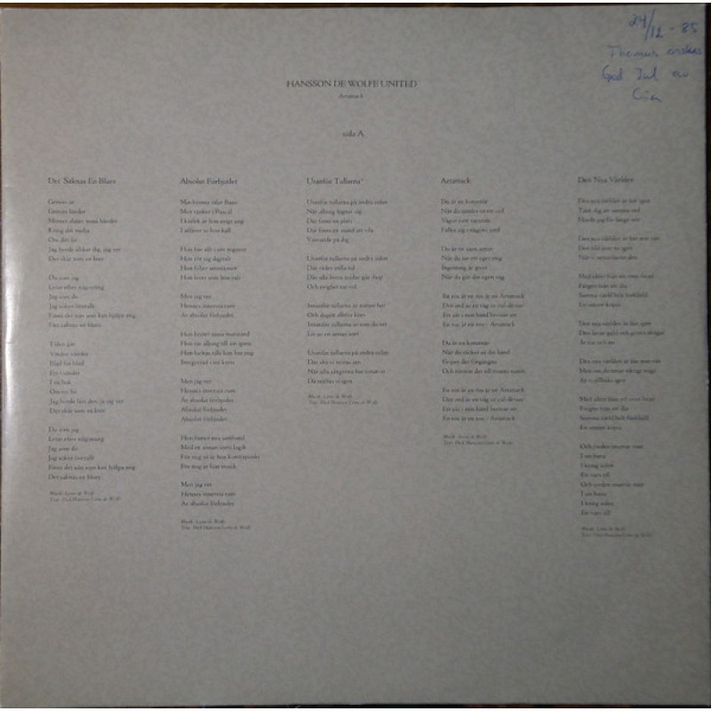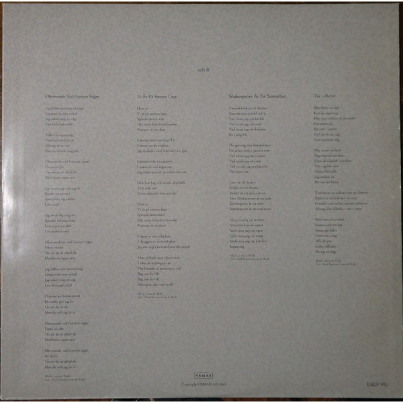 Notes: This release has inner sleeve with text printed on grey background. In addition, the outer sleeve has been prepared with a lustreless surface. As such it is distinct from [r=2603161], having white inner sleeve and shiny outer sleeve. The first reported copy of this release has an owners mark in ballpoint ink claiming it as a gift on December 24th, 1985, so it is contemporary to the other mostly similar release. Inner sleeve with printed lyrics. [On outer sleeve] Recorded at Cutting Room Studio, Stockholm Copyright EXMAX AB 1985 Track A3, "Utanför Tullarna", is dedicated to the memory of Lynn Munthe de Wolfe: 21/5 1951 –- 4/10 1985