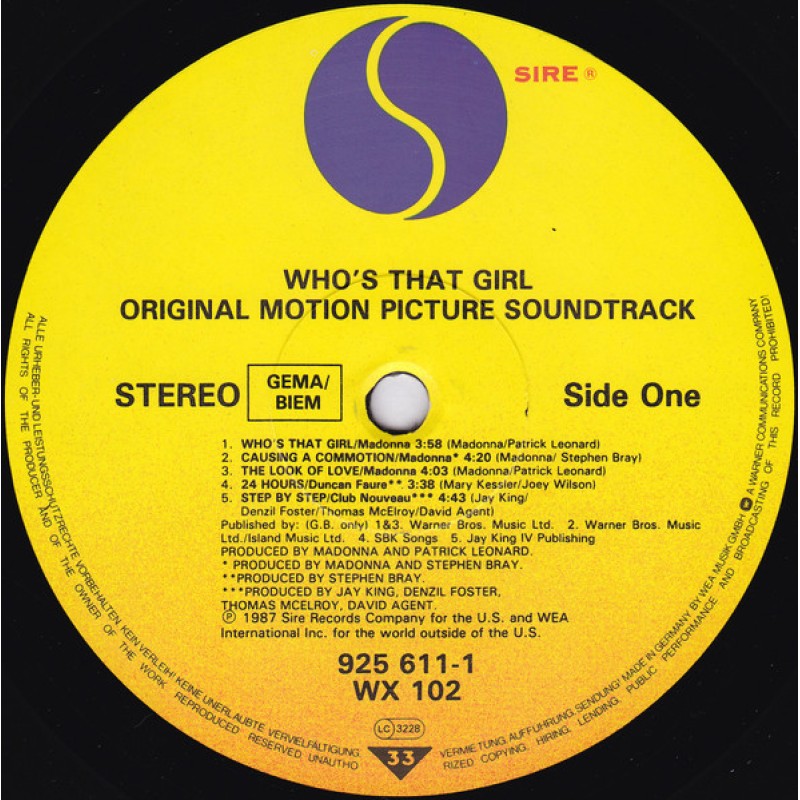 Notes: Published by: (G.B. only): A1 & A3 Warner Bros. Music Ltd. A2 Warner Bros. Music Ltd./Island Music Ltd. A4 SBK Songs. A5 Jay King IV Publishing. B1 Warner Bros. Music Ltd. B2 Chrysalis Music Ltd. B3 Warner Bros. Music Ltd./Island Music Ltd. B4 Coati Mundi Music. Scritti Politti appears courtesy of Warner Bros. Records Inc. in the US & Canada and courtesy of Virgin Records outside of the US & Canada. Club Nouveau appears courtesy of Warner Bros. Records Inc. © 1987 Warner Bros. Inc. Marketed by Warner Bros. Records Inc. ℗ 1987 Sire Records Company for the U.S. and WEA International Inc. for the world outside of the US. Manufactured in Germany by Record Service GmbH, Alsdorf. Some issues have two stickers on the cover sleeve. Sticker one: "Also Featuring: Scritti Politti, Club Nouveau, Coati Mundi, Michael Davidson, Duncan Faure 925 611-1" Sticker two for the german market: "bundesweiter Kinostart: 24.09.87 925 611-1" and some issues for the UK market: "Includes Causing A Commotion, Who's That Girl, The Look Of Love UK: WX 102 925611-1 This sticker is removable" Runouts are stamped from "R/S" up to the side identifier and any contiguous digits; the rest is etched.