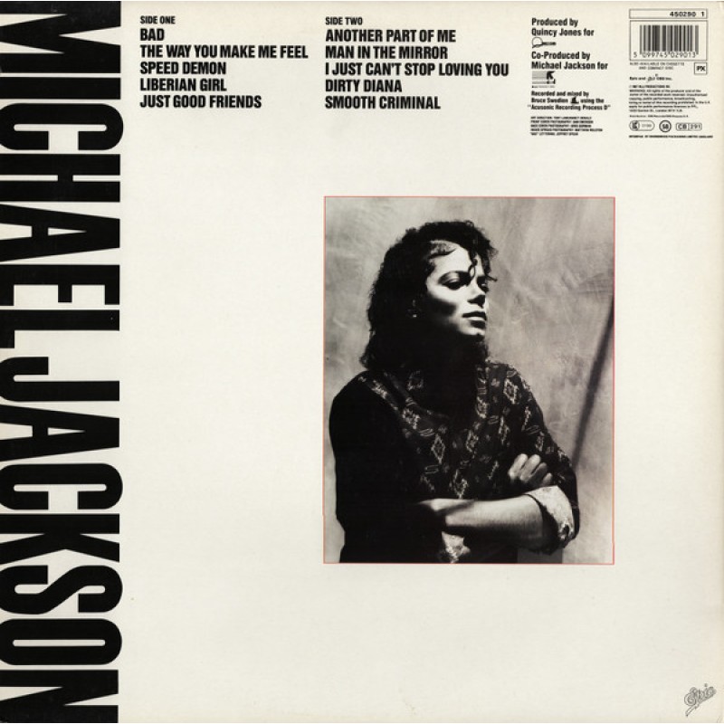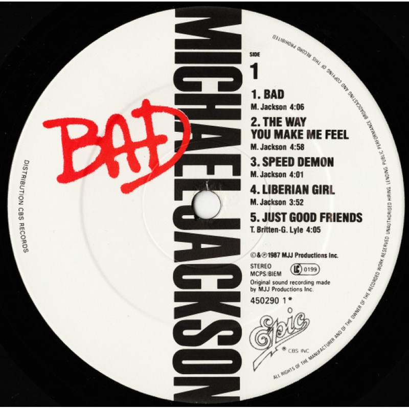 Notes: Recorded and mixed at Westlake Audio Studios, Los Angeles, California. Includes inner sleeve with lyrics. Runouts are hand etched except for "AD2" which is stamped (and oriented upside down relative to the etched part). A version exists with identical sleeve but without the asterisk after the catalogue number on the label [r=1566867] Some full retail copies were put out with a gold stamp on the back of sleeve which states "Property of CBS demonstration only not for sale". Some copies would be pulled from distribution, stamped, and then sent out to stores, radio stations and other assorted industry works. In the U.K. apply for public performance licenced to PPL, 14/22 Ganton St., London W1V 1LB ©&℗ 1987 MJJ Productions Inc.