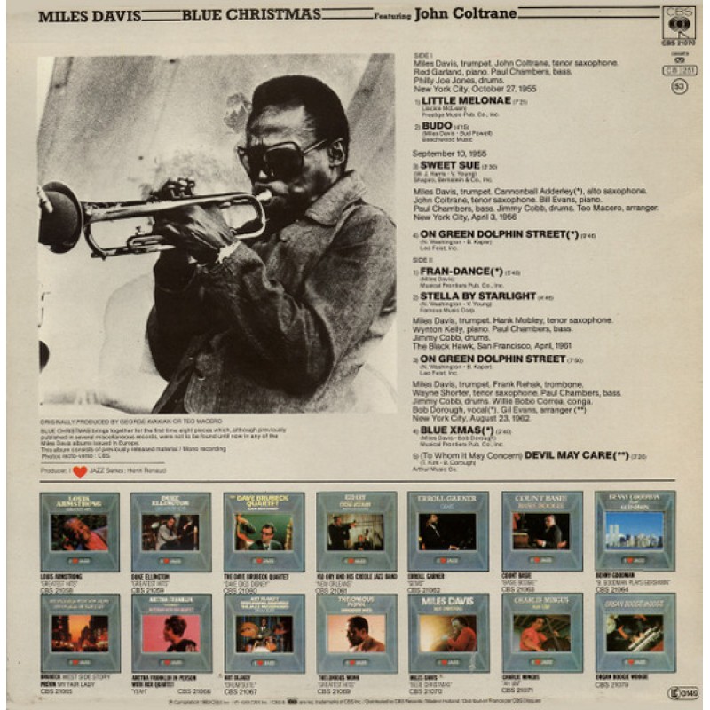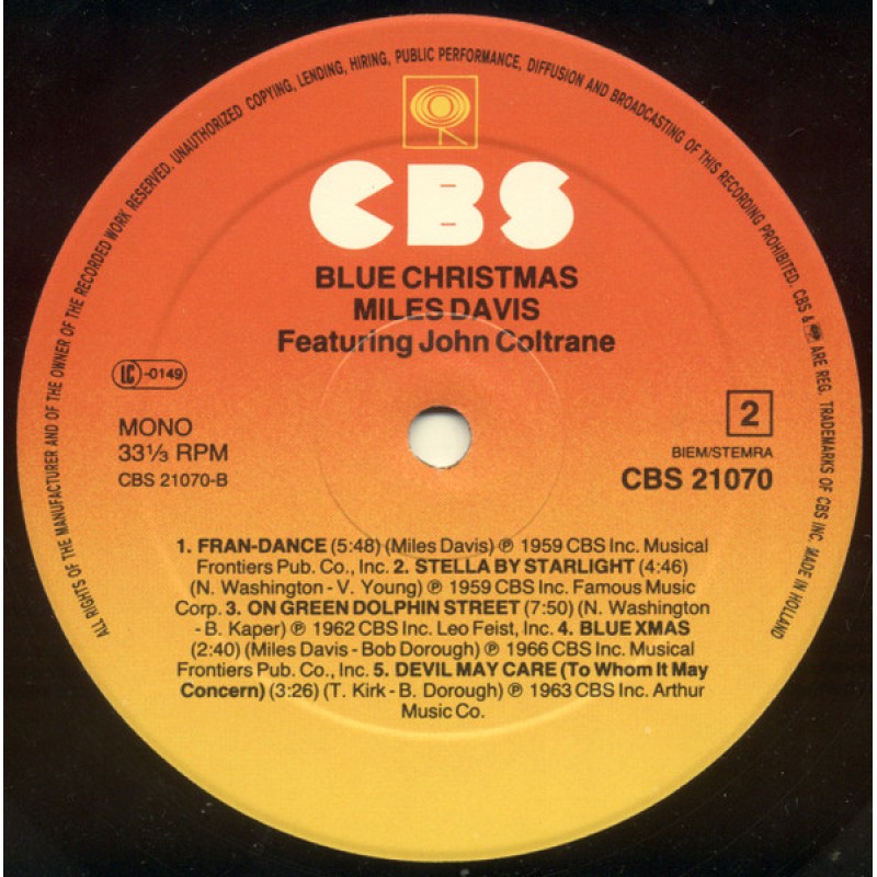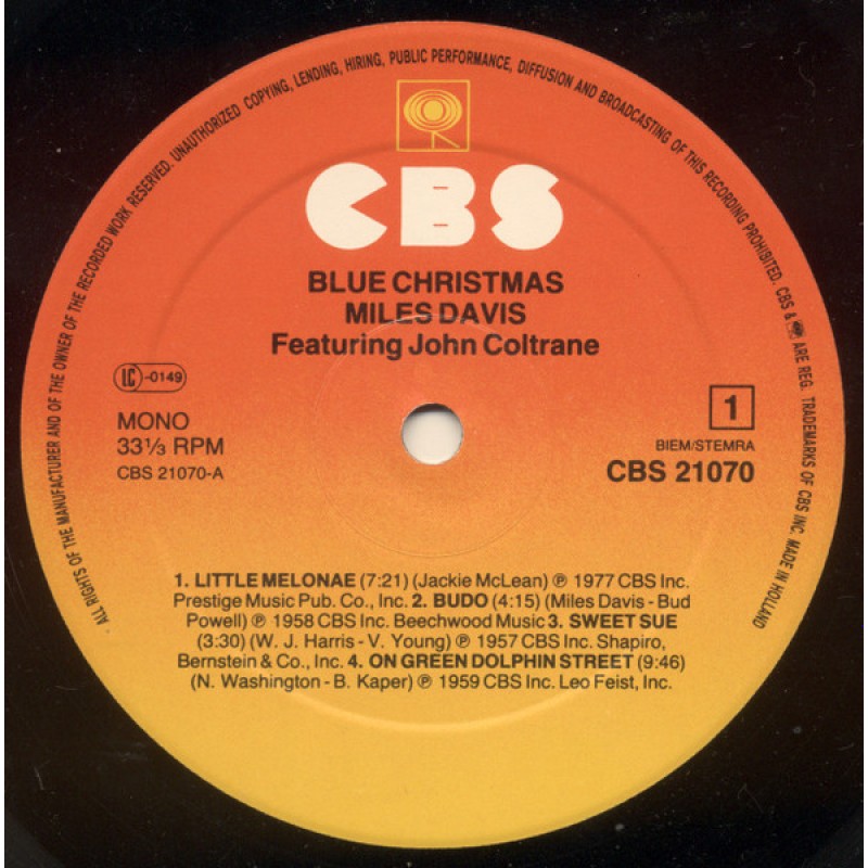 Notes: A1 - A2: New York City, October 27, 1955 A3: New York City, September 10, 1955 A4 - B2: New York City, April 3, 1956 B3: The Black Hawk, San Francisco, April, 1961 B4 - B5: New York City, August 23, 1962 Blue Christmas brings together for the first time eight pieces which, although previously published in several miscellaneous records, were not to be found until now in any of Miles Davis albums issued in Europe. This album consists of previously released material / Mono recording. Very similar to [r=14316425] but that release has an asterisk (*) next to the boxed side indicator on the labels.