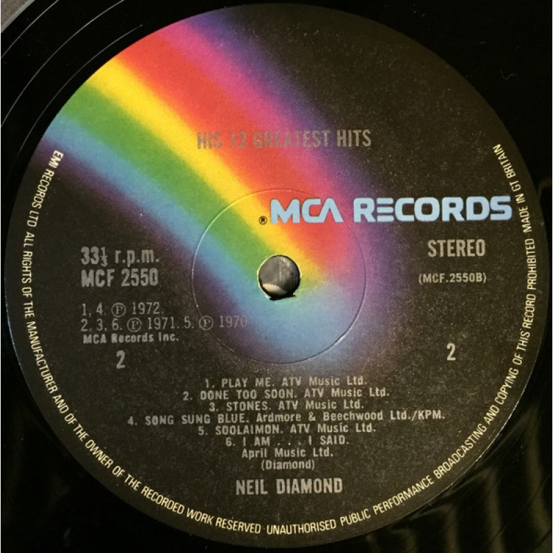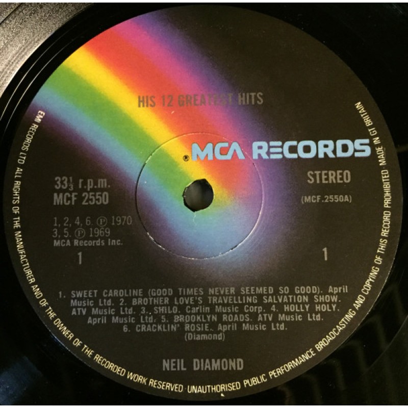 Notes: Another rainbow label variant to the similar UK versions [r=1563222], [r=7156849], and [r12563531]. April Music Ltd for "Sweet Caroline", rather than ATV Music Ltd