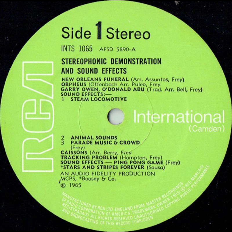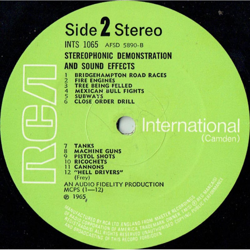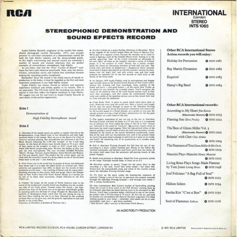 Notes: Front cover: Stereo action The sound your eyes can follow Demonstration and sound effects record On spine: Demonstration and sound effects record RCA International Stereo action On rear cover: Stereophonic demonstration and sound effects record An Audio Fidelity production RCA Limited, Record Division, RCA House, Curzon Street, London W1 © 1970 RCA Limited Sleeve printed in England by Clout & Baker Ltd. On labels: Manufactured by RCA Ltd England from master recordings of Radio Corporation of America Stereophonic demonstration and sound effects An Audio Fidelity production ℗ 1965 A1 to A9, B1 to B12 MCPS A10 Boosey & Co. Side A is unbanded. Has different labels compared to [r=1119092]